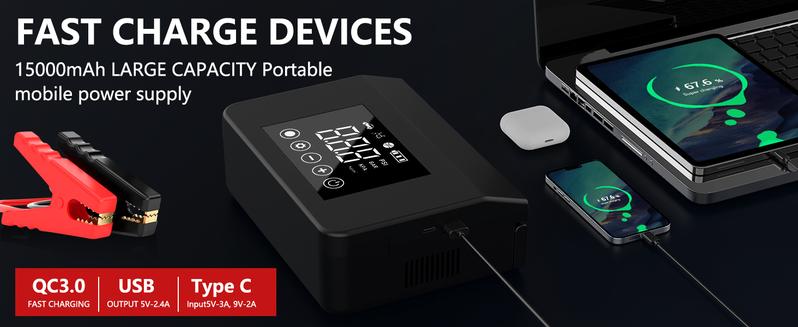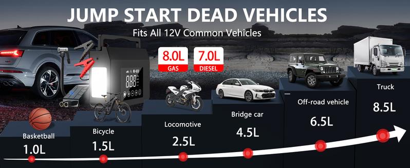 路銆?/span>4000A Jump Start Battery Pack銆?/span>The 15,000mAh jump starter is equipped with a peak current of 4000A, enabling it to start 12V vehicles (8.0L gasoline/7.0L diesel engine, including hybrid power) in just 3 seconds. Even in low temperatures (-20掳F to 70掳F), it exhibits superior starting performance with just 80% battery capacity. This portable jump starter can initiate the vehicle up to 50 times and boasts a service life of over 1000 charge cycles.