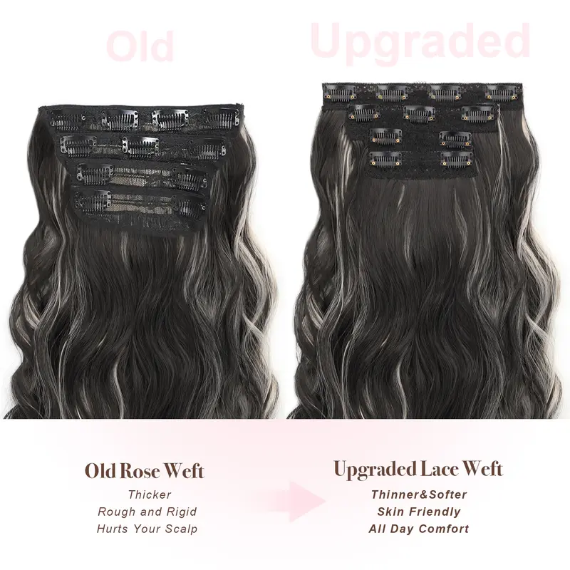 - What’s in the Pack鈼?聽4pcs extensions+gift box :鈼?1 x 7.5″ width with 4 clips鈼?1 x 5.5″ width with 3 clips鈼?2 x 4″ width with 2 clips鈼?1xcomb鈼?1xAlligator clip鈼?3xHair tiesLength: 24″ | Weight: 190g total Next-Level Lace Weft 鈥?way thinner, softer, and lighter than those old-school rose wefts. Wear all day, zero heaviness, zero itch 鈥?just pure comfy glam.