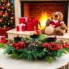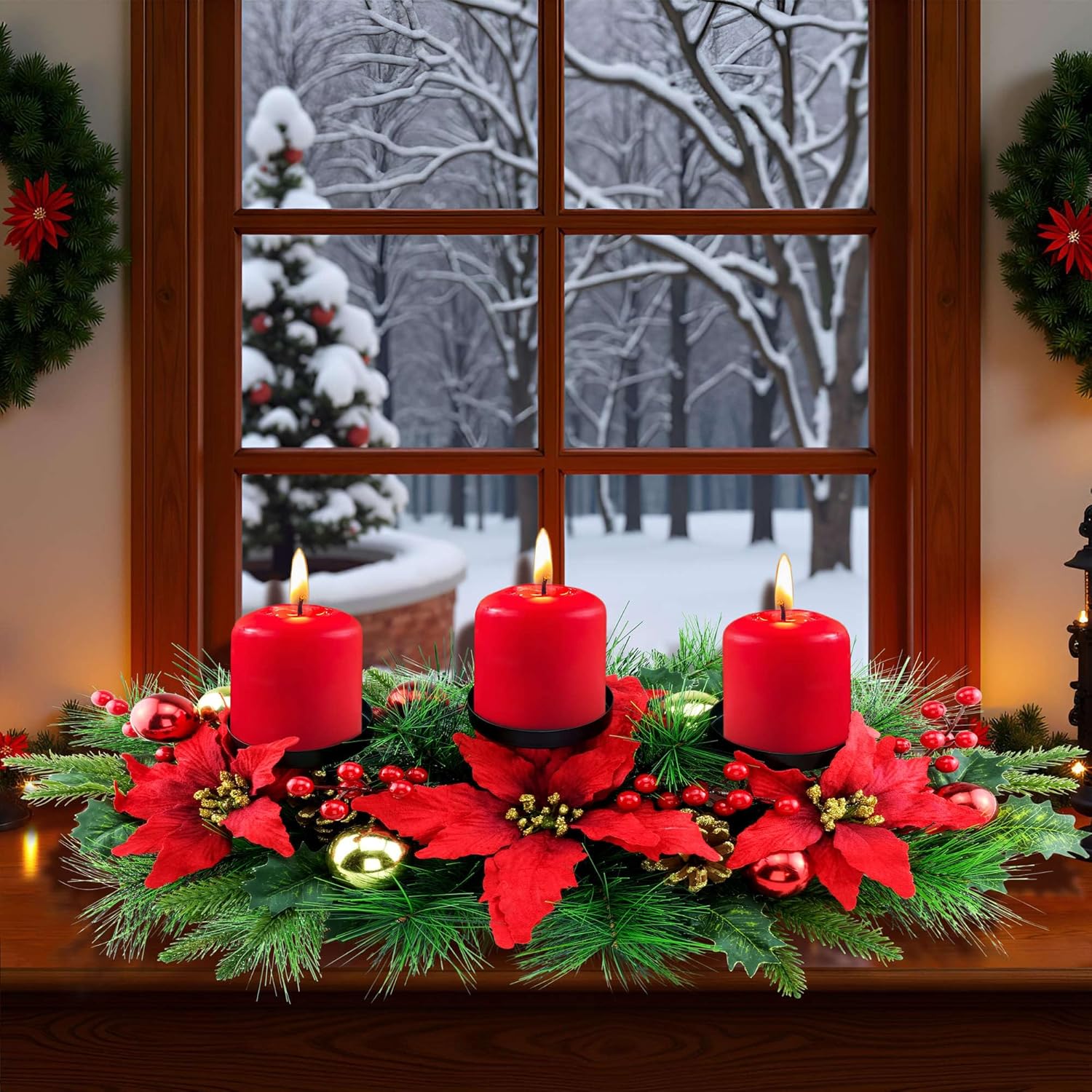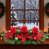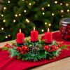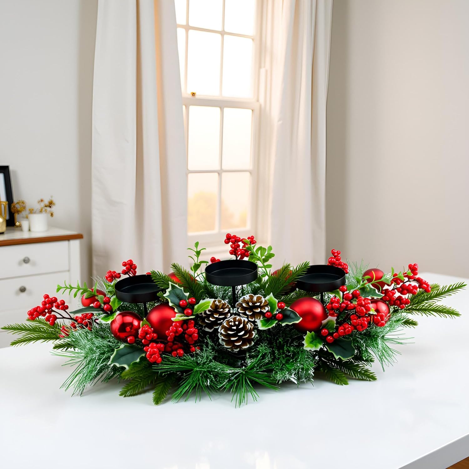 With its festive decorations including red baubles, natural pine cones, red berries, green holly leaves, spruce branches, and pine needles, this candelabrum captures the essence of the holiday season. Its 28-inch width, 10-inch length, and 6-inch height make it a stunning centerpiece for your Christmas dinner table or a charming addition to your fireplace mantel.