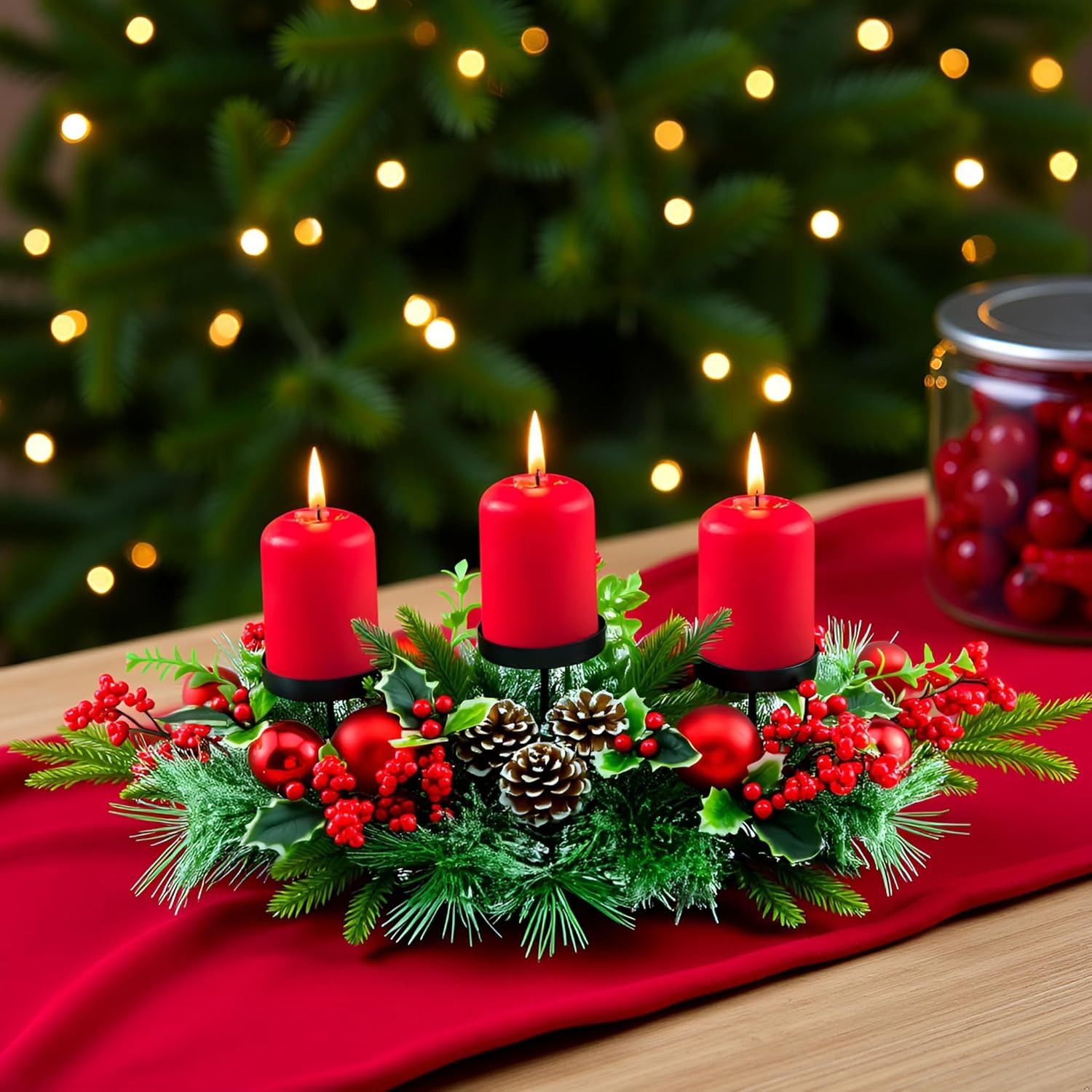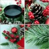 Exquisite Design 鈾?Embracing a metal body intricately wrapped in natural rattan, our holiday candle holder is adorned with a festive blend of red baubles, pine cones, red berries, green leaves holly, spruce branches and pine needles, setting a perfect Christmas theme.
