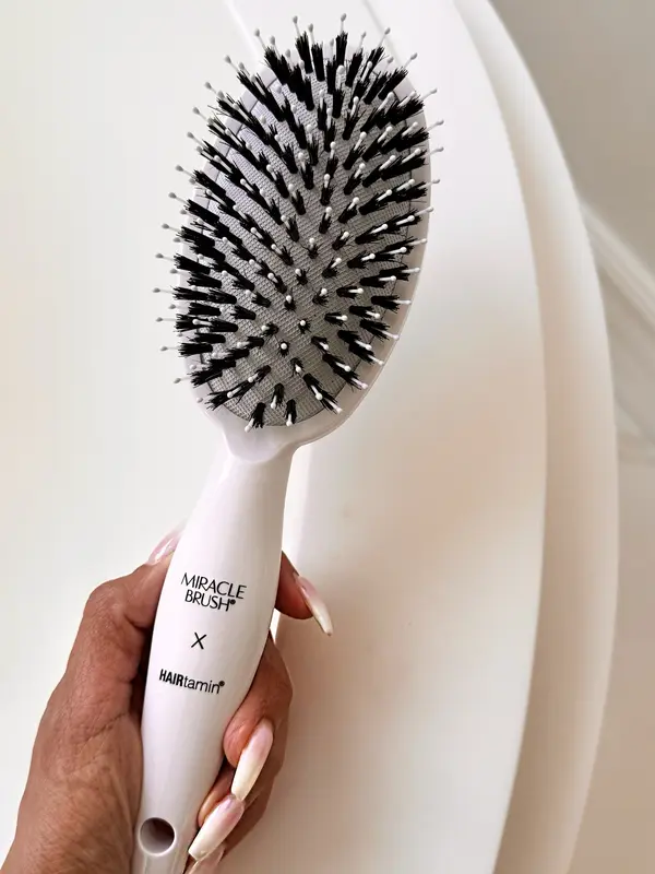 The viral Miracle Brush for HAIRtamin is a state-of-the-art paddle brush with dual boar and nylon bristles and microsphere massaging tips.
