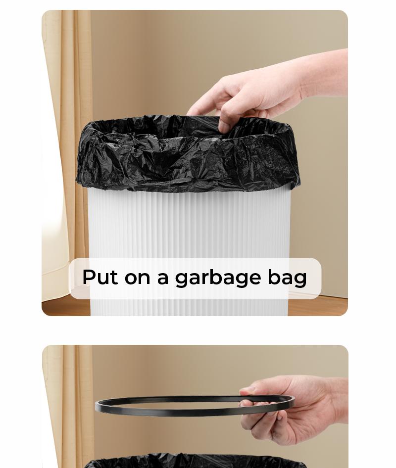 路Installation: Requires 2 AA batteries (not included). Customers need to install the batteries and follow the steps to put on the garbage bag.