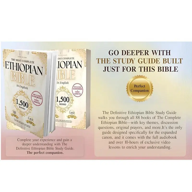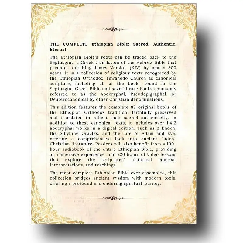THE COMPLETE ETHIOPIAN BIBLEDiscover the Complete Ethiopian BibleThis edition includes all 1500 books of the Ethiopian Bible, with 88 original printed scriptures and 1,412 digital editions. It’s a comprehensive resource for study and reference. The book covers the Apocrypha, including the Book of Enoch and Jubilees. It’s a promise paperback edition, perfect for handy reading.Features and Highlights路Handy Size: Easy to carry and read anywhere.路Study Material: Ideal for deepening your understanding of the Bible.路Comprehensive Text: All 1500 books included, ensuring you have access to the complete text.路Sibylline Oracle: Part of the collection, adding depth to your study.Perfect for Your NeedsThis edition is a must-have for anyone seeking a complete and comprehensive understanding of the Ethiopian Bible. It combines traditional printed scriptures with modern digital editions, making it a versatile tool for study and reference.