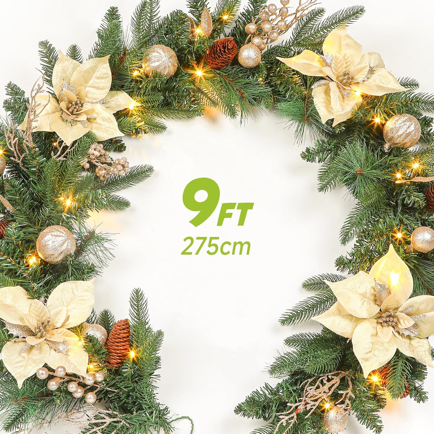 銆?/span>Perfect Christmas Decoration銆?Adorn your home with our exquisite 9 foot lighted Christmas garland, beautifully decorated with multi-color LED string lights, pine cones, gold berries, Christmas ball ornaments, and champagne gold artificial poinsettia flowers. This festive lighted Christmas garland is designed to enhance your holiday atmosphere, bringing the spirit of Christmas to any space.