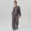 Made from soft, solid-colored fabric, this set features a stylish sloping shoulder design and long sleeves, paired with matching trousers for an elegant appearance. 路Material:95%Polyester+5%Elastane